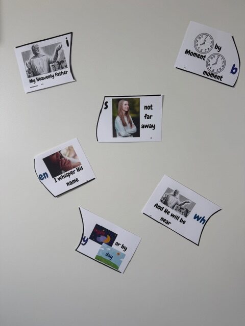 Here is a puzzle to help you teach this song. Cut the paper in half on the middle line, then cut each half in half on the middle line between the phrases. You can place all the pieces for verse one randomly on the board. You could have the children match the phrases. Then you sing the whole first sentence and have the students figure out which sentence goes first. Review that. Then repeat as you move through the first verse. This is what your board might look like.