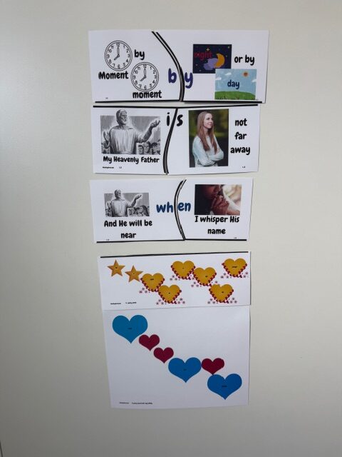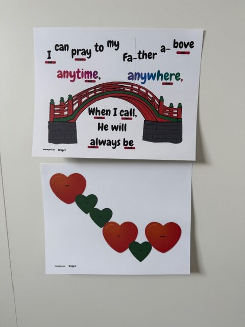 The bridge phrase is easy to recognize. The visual has a big bridge on it! Then “close as a quiet prayer” in hearts of the same color as the bridge. Here are those pictures.