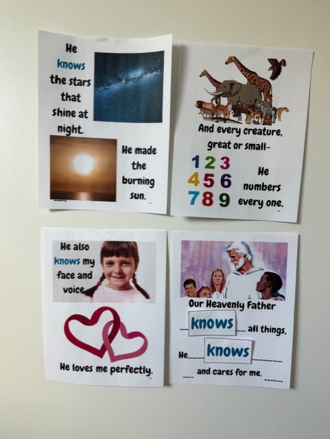 If you are using the flipchart, you can point out at the first of your lesson that the last line of this song is the same, except for a few words. This song will be teaching three truths about their Heavenly Father. He knows all things, He hears all things and He loves us all.