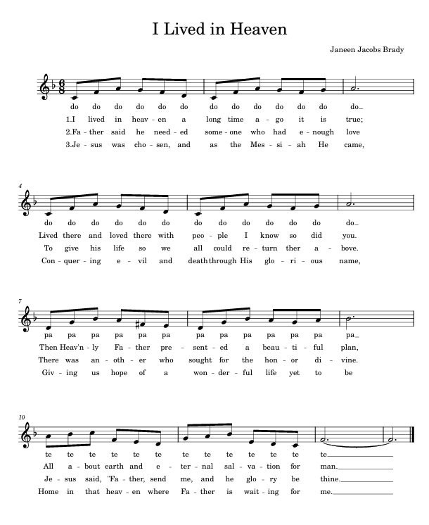 Here is a melody sheet. Make a copy for your children to hold. You could have the children point to the note on the staff and sing the easy words (do, pa, te) as the pianist plays the melody. Point out that the first and second lines are the same pattern. This exercise will help them get used to the jumps, directions and patterns of this song.